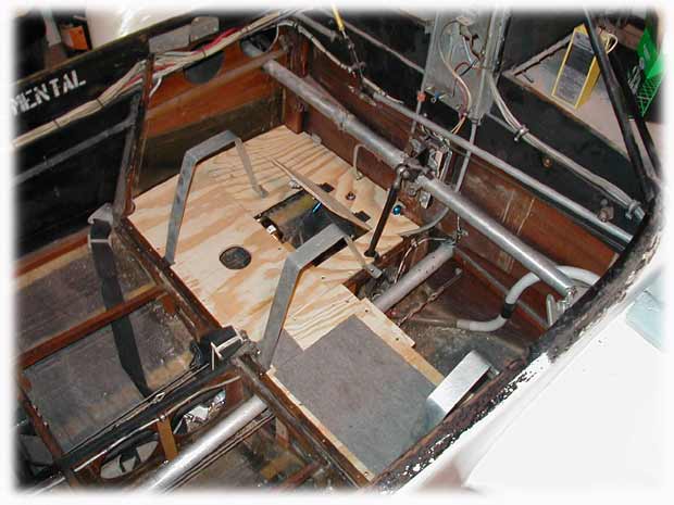 New aft floorboards have been made from plywood, and aluminum support bands have been installed to accommodate an auxiliary fuel tank in the hull.