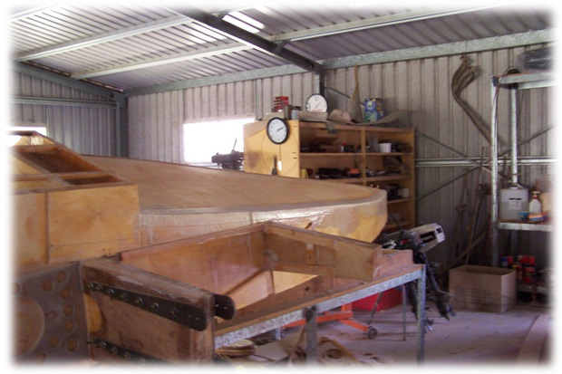 Here we see the aft part of the hull, completely planked and covered with a layer of fiberglass.